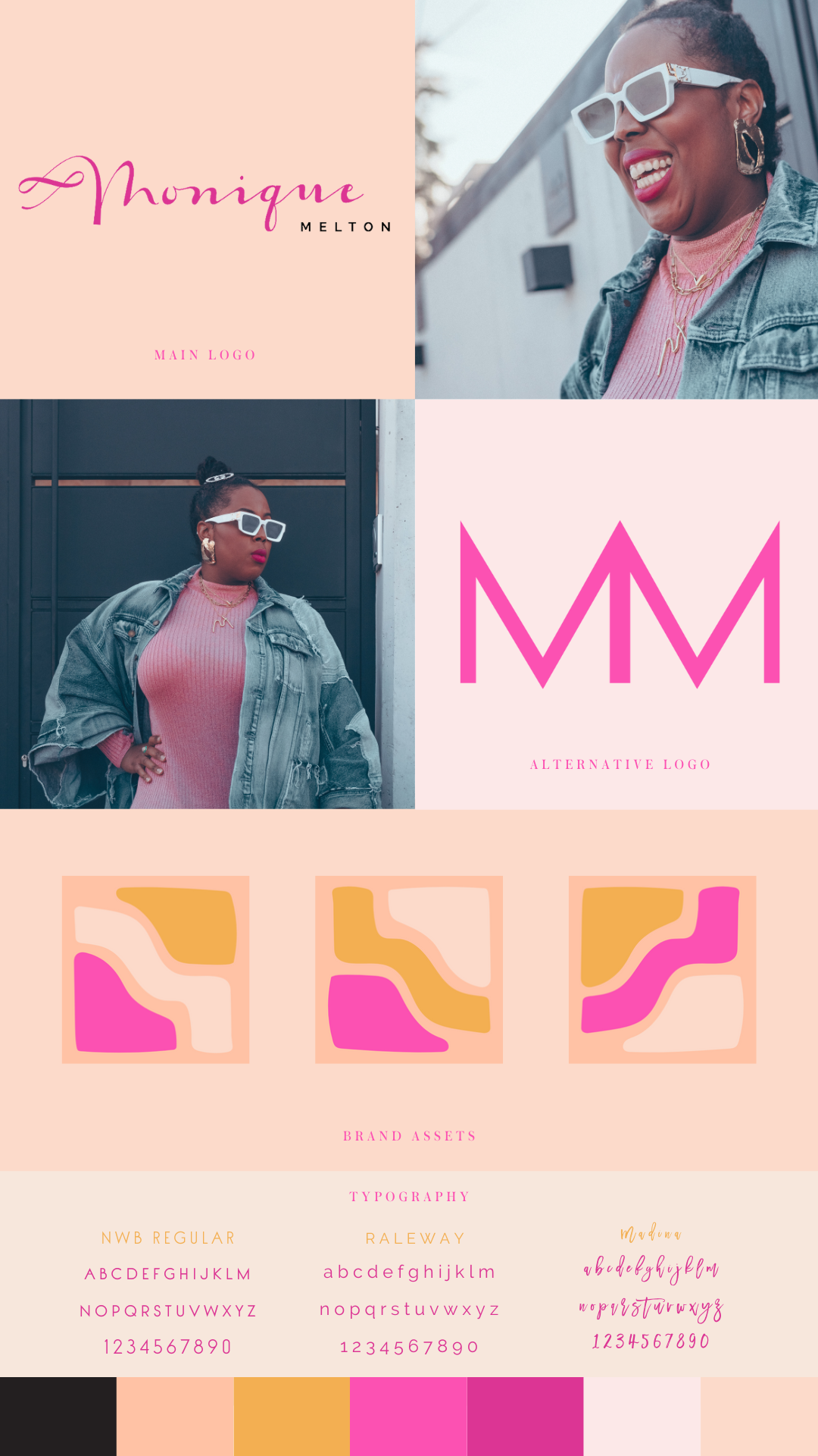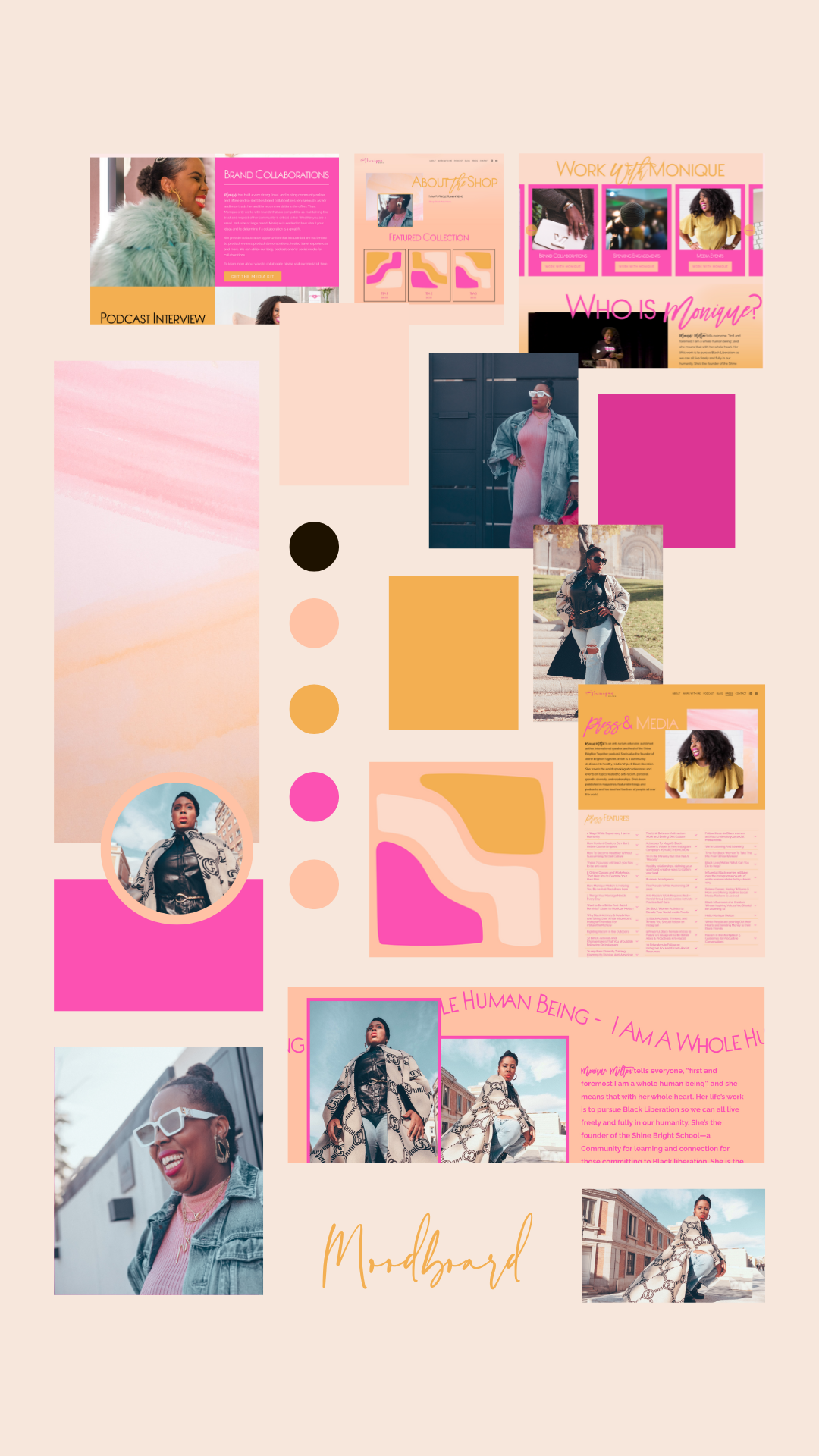 We started curating a new brand color palette based on Monique’s signature pinks (hot pink & light pink), from there we added a third pink, peach hues, pop of daffodil yellow. The result was a bright, fresh look. To connect to her Shine Bright School we implemented the same typography.